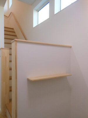 緩やかな勾配の階段は、下から見上げた時には白い側板が印象的な明るい階段となり、日中なら照明なしで過ごすことができます。