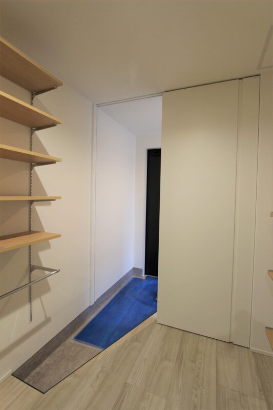 フルハイトドア(神谷コーボレーション)なので一見すると壁に見える玄関ドア正面は吊り扉の引き違い戸なので