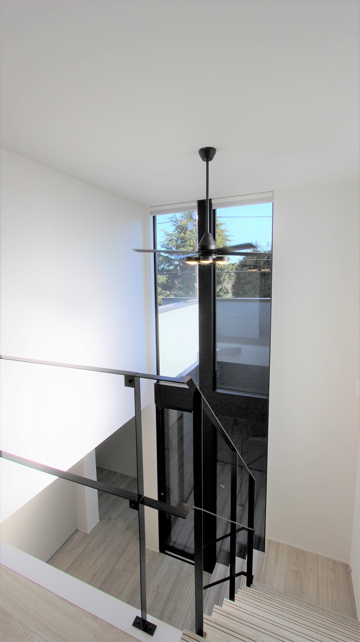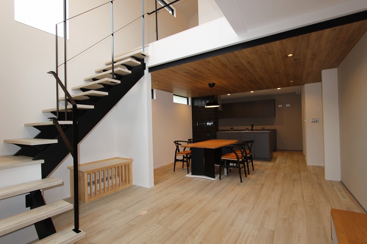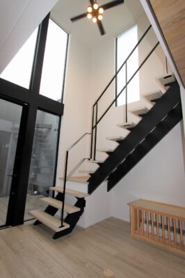 オーダーしたアイアン手すりが印象的なオープン階段が家全体に一体感をもたらしてくれます。