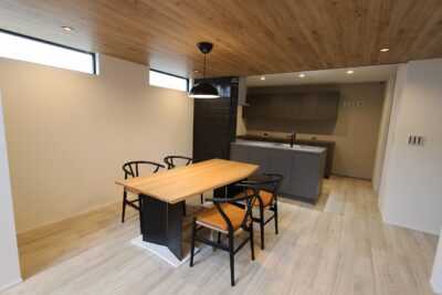 天井を低くして、落ち着いた雰囲気にしたダイニングは、ペンダントライトが映える空間としました。