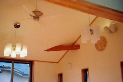 2階リビングの利点を活かして、勾配天井にしています。頂点近くの小窓からは、夜になると月を楽しむことが出来、また、廊下に面する小窓を通じて月明かりで夜中でも廊下が明るい仕組みです。